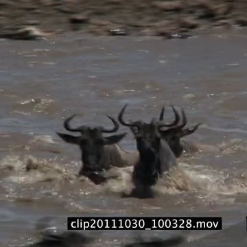 Blue Wildebeest herd running crossing river MWS PAN HAND AmCam