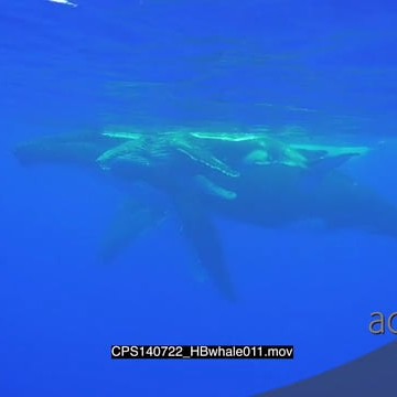 Two (2) Humpback Whale Adults and a calf swimming slowly underwater at surface PROFILE HAND UW
