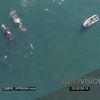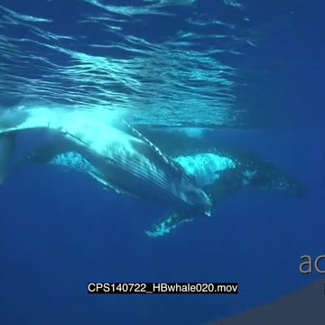 Humpback Whale and calf playful at surface, with freediver following whales UW HAND