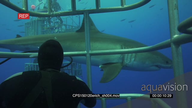 Shark cage diving with Large Great White Shark swimming past cage UW