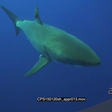 Large Great White Shark approaching, swim past in deep blue ocean UW MS PAN