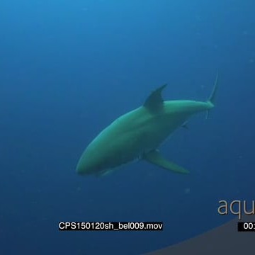 Large Great White Shark approaching, swim past in deep blue ocean UW MLS TD HAND