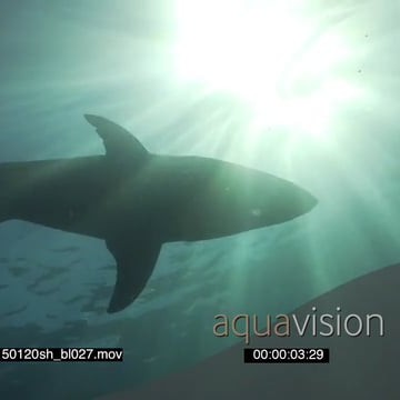 Great White Shark swimming underwater in ocean with sun shinning through LA LS PAN