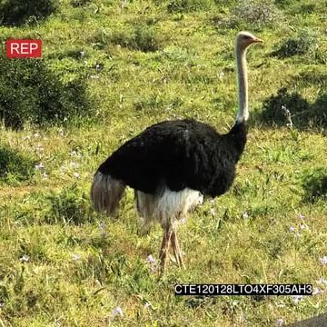 Ostrich standing on bushveld looking around LS