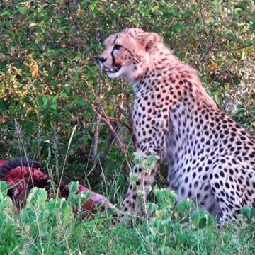 Bloody Cheetah sitting next to a kill and looking around on bushveld MLS
