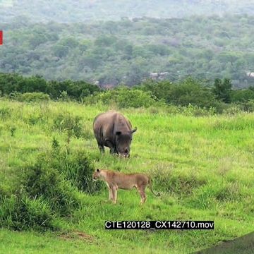 African Lionesses running away from grazing White Rhino in bushveld XLS