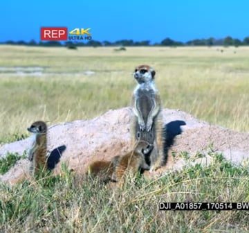 Three baby meerkats standing with their mother looking around the field Alert and one suckles