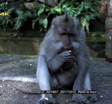 Two adult Balinese long tailed monkey eating a sweet potato with a baby suckling from the mother