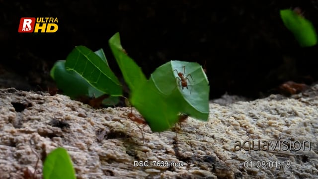 Leafcutter ants (Atta sp.) carrying pieces of leaves and flowers over a treestump in the rainforest, real speed close-up.