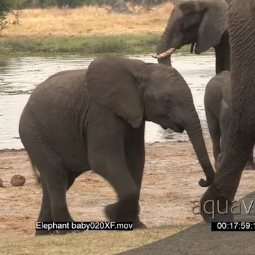Elephant calf walking next to mother and the rest of the herd at the river drinking water MS