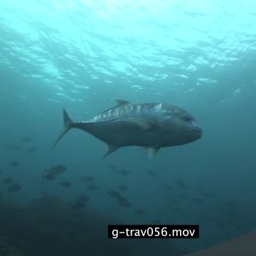 Giant Kingfish swimming and turning underwater in ocean and schools of varied sea fishes passing by in background LWS PAN HAND