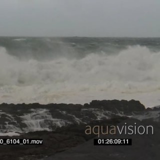 Big waves rolling in over rocks Overcast conditions