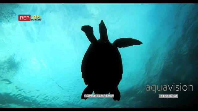 A hawksbill turtle floats up to the surface of the ocean and becomes a silhouette