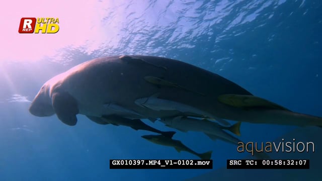 Close up side view shot of a dugong eating, then it swims up among the God rays