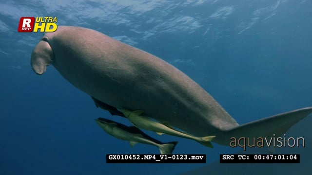 Reveal shot of a sleeping dugong that wakes up and swims to the surface to breathe