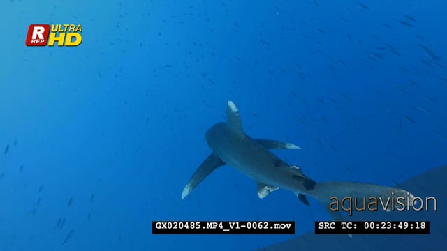 An ocean whitetip shark swims towards the camera