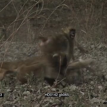 Yellow baboons males fighting with one another and then chasing after and running away through the trees during the day