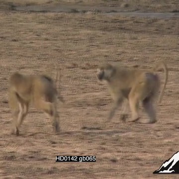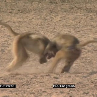 Yellow baboons chasing a sub dominant male close to the riverbank during the day