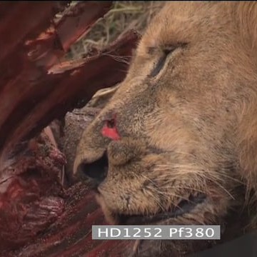 Wounded African Male lion with big gash on nose injured feeding on carcass with 2 lionesses in dry riverbed