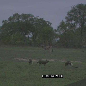 African Wild dog pack stalking zebras grazing alerted in the distance