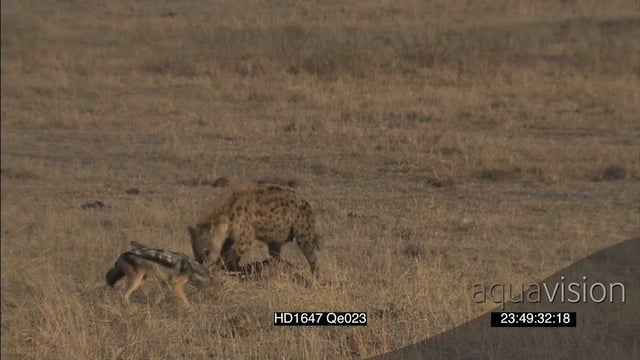 African Lioness running towards chasing Spotted Hyena and Black-backed Jackals away from carcass remains