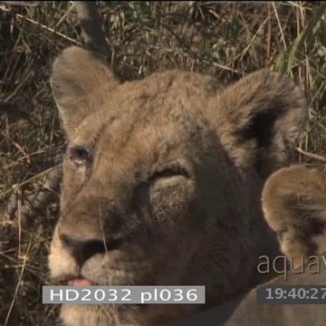 Wounded African lioness looking across laying head down