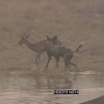 African Wild dog Takedown kill feed on Impala calf near riverbank as rest of pack crosses through river to join in on feeding