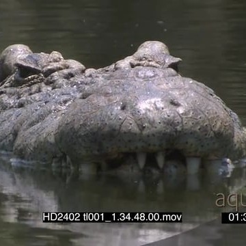 Nile Crocodile half sub-merged in water facing camera hunting zoom in scales pan along body submerged in water