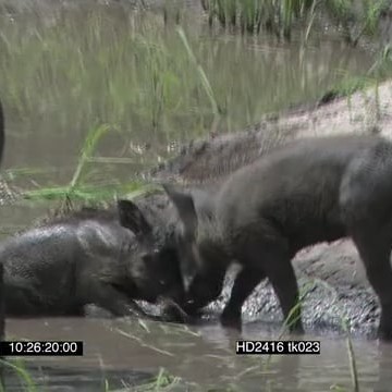Warthogs graze, lay in water, Piglets joust and fight WS MS MCU