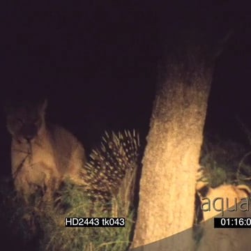 Lion pride surround stalk attack Cape Porcupine with raised quills defensive behaviour as lion gets stung by quills at NIGHT