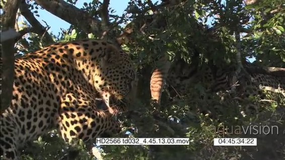 Leopard stand off fighting over carcass in tree as 1 leopard escapes runs down tree