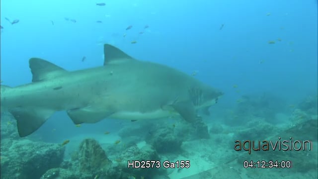 Pregnant female Spotted Ragged Tooth Sharks swimming over reef and ocean floor.