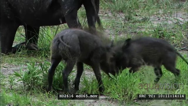 Warthog piglets [2] sparring and Adult Warhogs [2] fighting on African savannah MS
