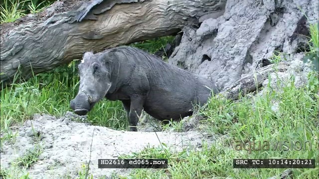 Female warthog reverses into burrow den, with her head facing the opening and ready to burst out if necessary.