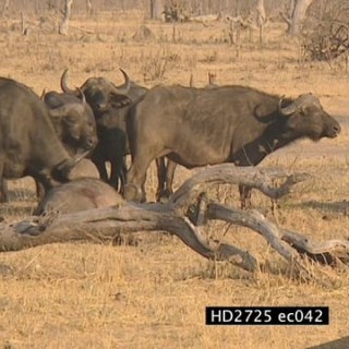 Herd of buffalos standing moving next to an injured buffalo and a sitting female lion MLS
