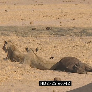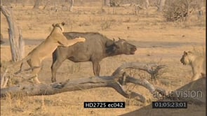 Female African lion pride sitting near injured Cape buffalo calf buffalo herd standing by MLS PAN
