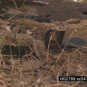 Banded Mongoose group chasing Mozambique Spitting Cobra on bushveld then running away from it and looking at it MS LS ZI ZO PAN