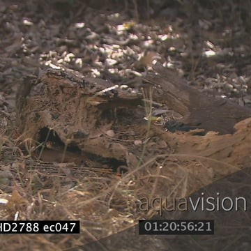 Mozambique Spitting Cobra laying on bushveld hiding under tree log and Banded Mongeese standing nearby MLS LS ZI ZO