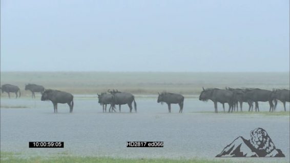 Blue Wildebeest Migration standing and drinking water on flooded plain in the RAIN