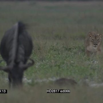 African Lioness stalking a grazing Blue Wildebeest from behind, FAILS 2 Shot