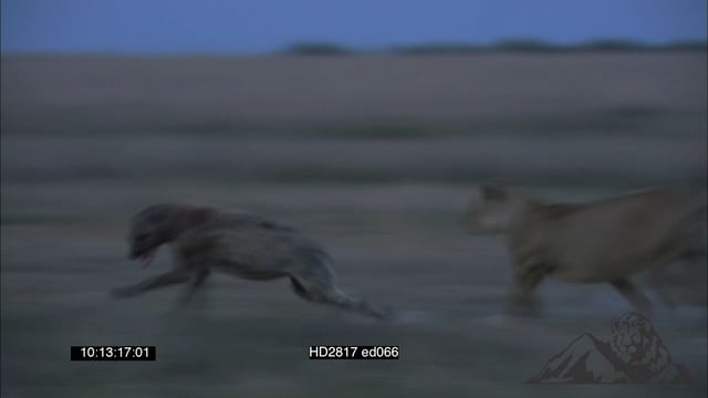 African Lioness chasing a Spotted Hyena