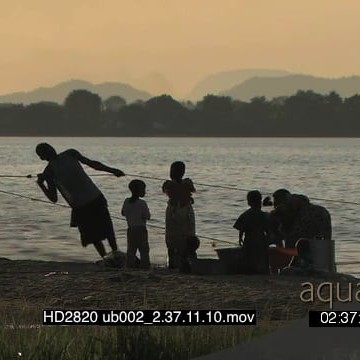 Local youn men pulling fishing nets out of river as the woman wash dishes nearby on riverbank