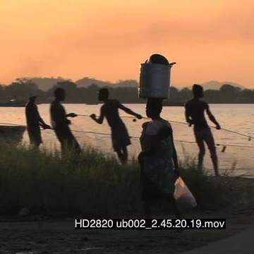 Local woman washing dishes pots on riverbank carrying them away on heads past local young men pulling fishing nets out of river zoom in group of people drifting away in canoe