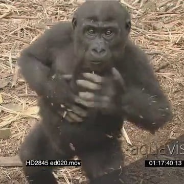 Young Gorilla on dry, grassy ground beating chest and looking at camera HA MS HAND