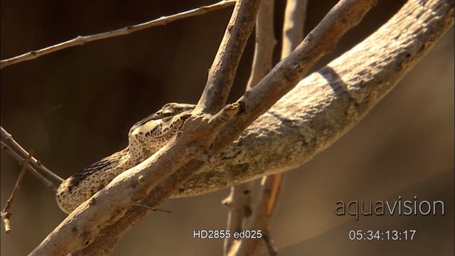 Vine snake hanging from tree swallowing lizard and slithering to digest its meal.