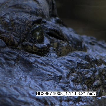 Nile Crocodile half sub-merged in the water, CU eyes facing the camera, then swims off to the right, XCU