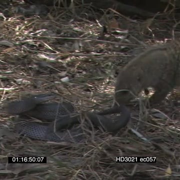 Banded Mongoose walking searching in bushveld woodland, attacking Olive House Snake protecting young from snake.