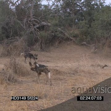 African Wild Dog pack patrolling stalk hunt warthogs as warthogs defend themselves charge chase wild dogs around