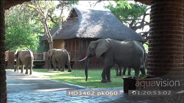 African elephant herd grazing in Mfuwe lodge courtyard MS