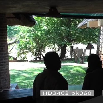 Guests looking as African elephants graze in Mfuwe lodge courtyard